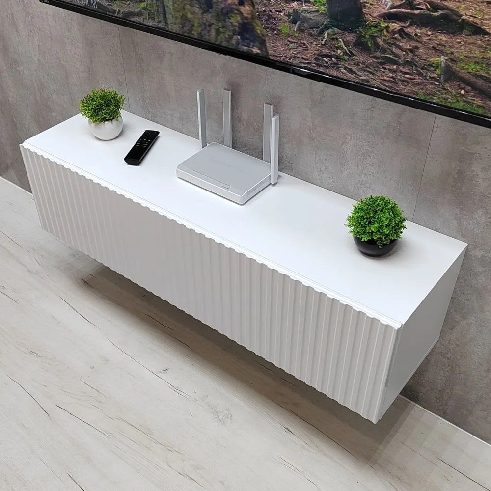 Благодаря своей компактности тумба под ТВ подвесная поможет сэкономить пространство, избежать ощущения загромождённости гостиной, спальни или детской комнаты, а рифлёный фасад будет акцентировать